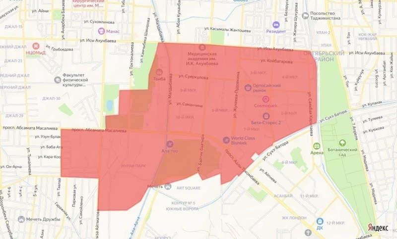 Отключение коснется следующих улиц: пр. Ч. Айтматова, ул. Абдрахманова, ул. Бакаева, пр. Масалиева, ул. Токтоналиева, парк Ата Тюрк, ул. Ахунбаева, р. Аламедин, ЮБЧК, ул. Б.Баатыра, река Ала Арча, ул. Семетей.