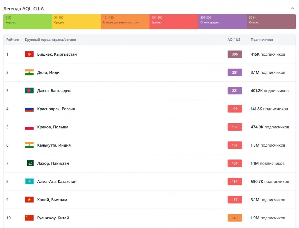 Бишкек стал лидером в мировом рейтинге городов с самым загрязненным воздухом.