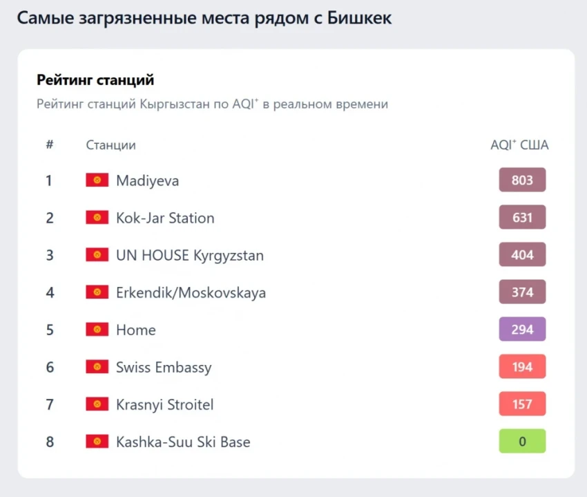 Кроме того, уровень мелкодисперсных частиц PM2.5 в Бишкеке превышает среднегодовые значения, установленные Всемирной организацией здравоохранения, в 48,1 раза. На момент 19:00 статус города оставался на уровне "опасно".