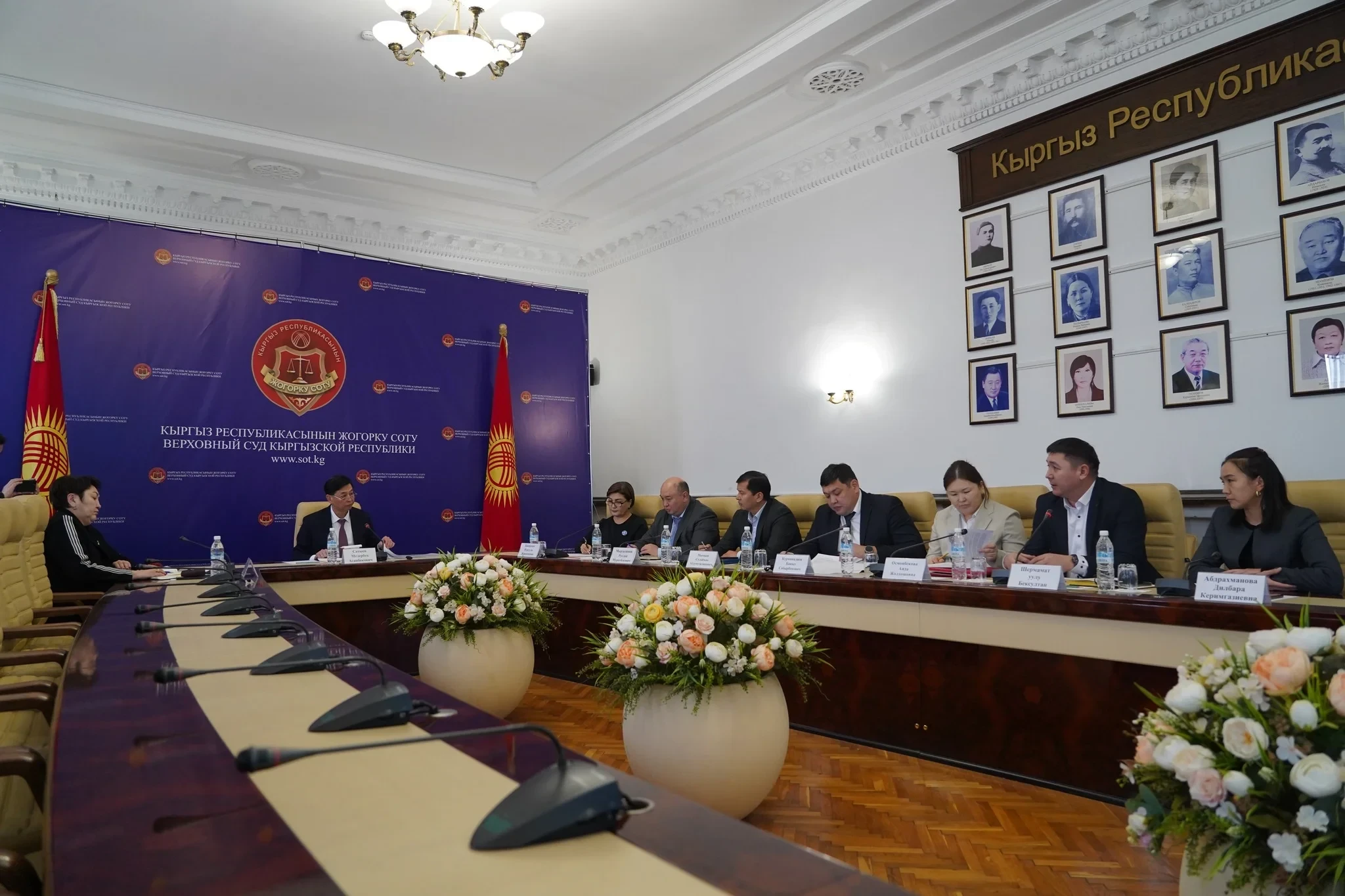 В заседании также присутствовали заместитель председателя Верховного суда Нургуль Бакирова, судья Верховного суда и председатель Совета судей Аида Сейдакматова, советник председателя Руслан Мырзалимов, руководитель аппарата Сулайман Мыкыев, директор Судебного департамента Бакыт Курманалиев и директор пансионата «Фемида» Шермамат уулу Бексултан.