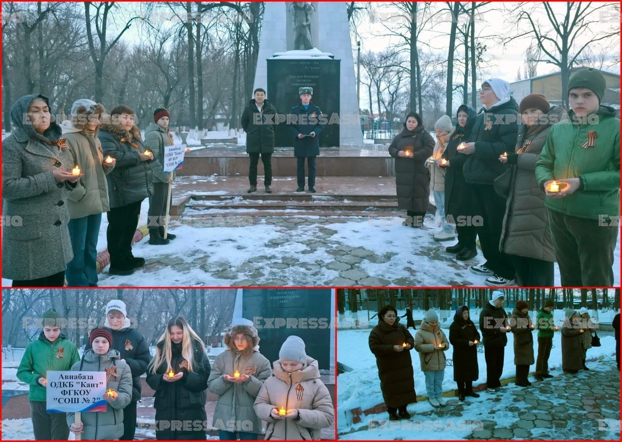 К памятнику героям Великой Отечественной войны собрались представители городской администрации, сотрудники Чуйской областной библиотеки, ученики местных школ и военнослужащие российской авиационной базы.