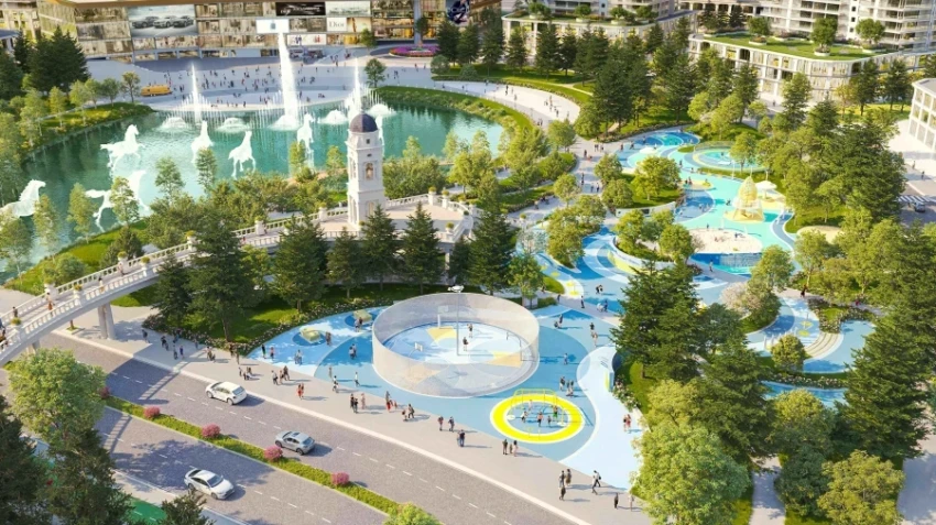 Визуализация музыкального фонтана и многофункциональной спортивной площадки Royal Central Park — планируется запуск в сентябре 2026 года