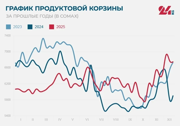В 2025 году цена продуктовой корзины возросла на 686 сомов. Самая низкая стоимость была зафиксирована 18 октября — 5 тысяч 791 сом, а максимальная — 6 декабря, составив 6 тысяч 927 сомов.