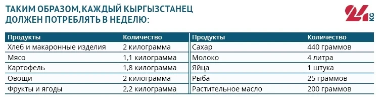 Нормативы питания для граждан Кыргызстана были установлены правительством еще в 2009 году. Согласно этому документу, каждый житель страны должен ежемесячно потреблять девять различных наименований продуктов.
