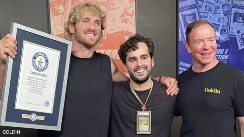 Логан Пол (слева), новый владелец карточки Скарамуччи (в центре) и Кен Голдин, владелец аукциона (справа),