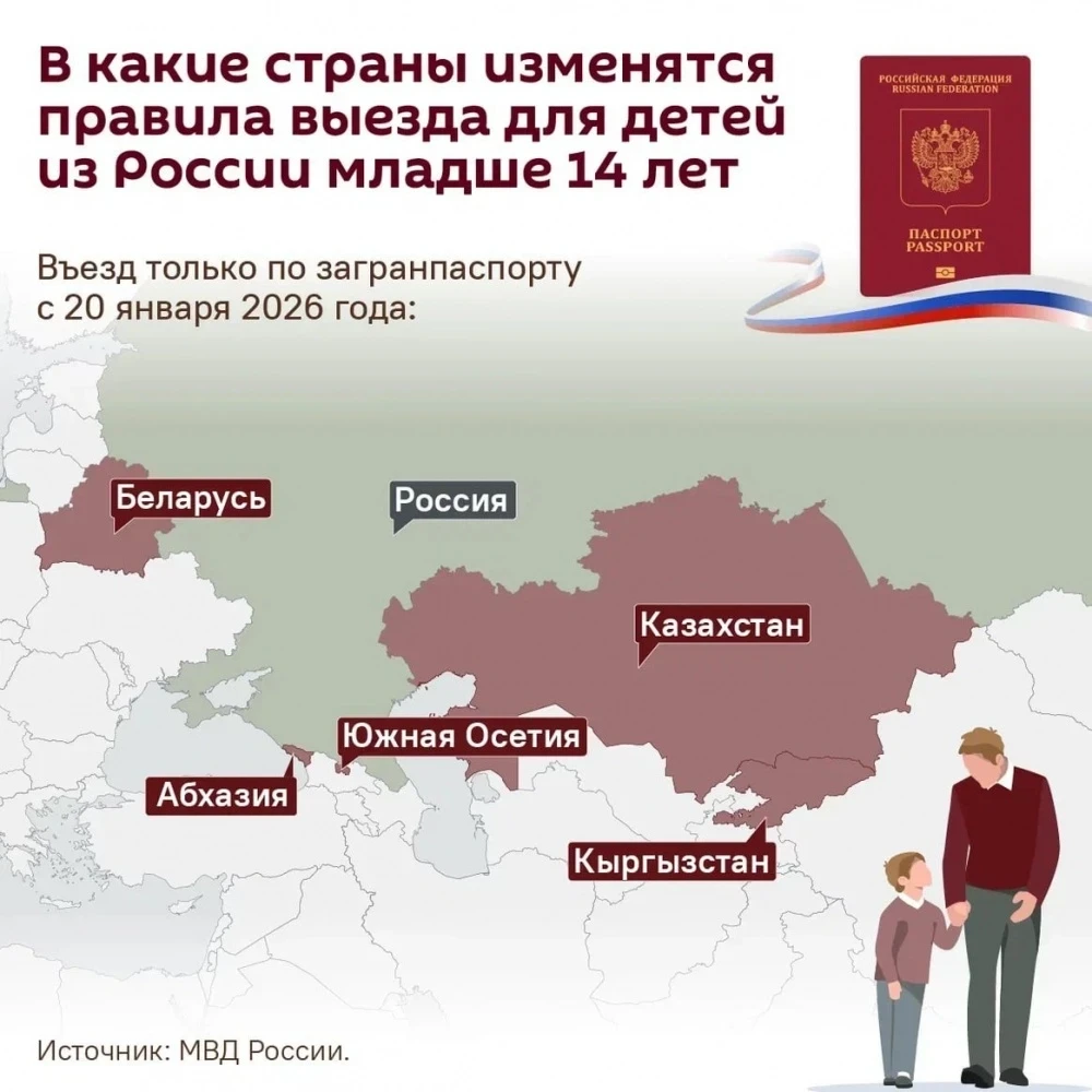 С 20 января 2026 года изменения в законе "О порядке выезда из РФ и въезда в РФ" вступают в силу, и теперь дети до 14 лет должны будут иметь заграничный паспорт для поездок в перечисленные страны. Свидетельство о рождении больше не будет являться достаточным документом для выезда.