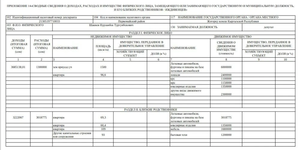 Декларация — 2024. Торага ЖК владеет движимым имуществом на 6 миллионов сомов