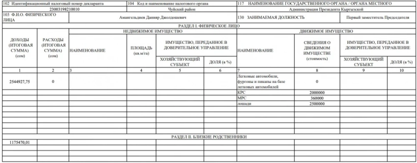 Амангельдиев указал, что его доход составил 2 млн 544 тыс. 927,75 сома. Расходов он не указал. У него нет автомобиля, но имеется крупный и мелкий рогатый скот на сумму 4,86 млн сомов. Родственники сообщили о доходе в 1 млн 175 тыс. 470 сомов.