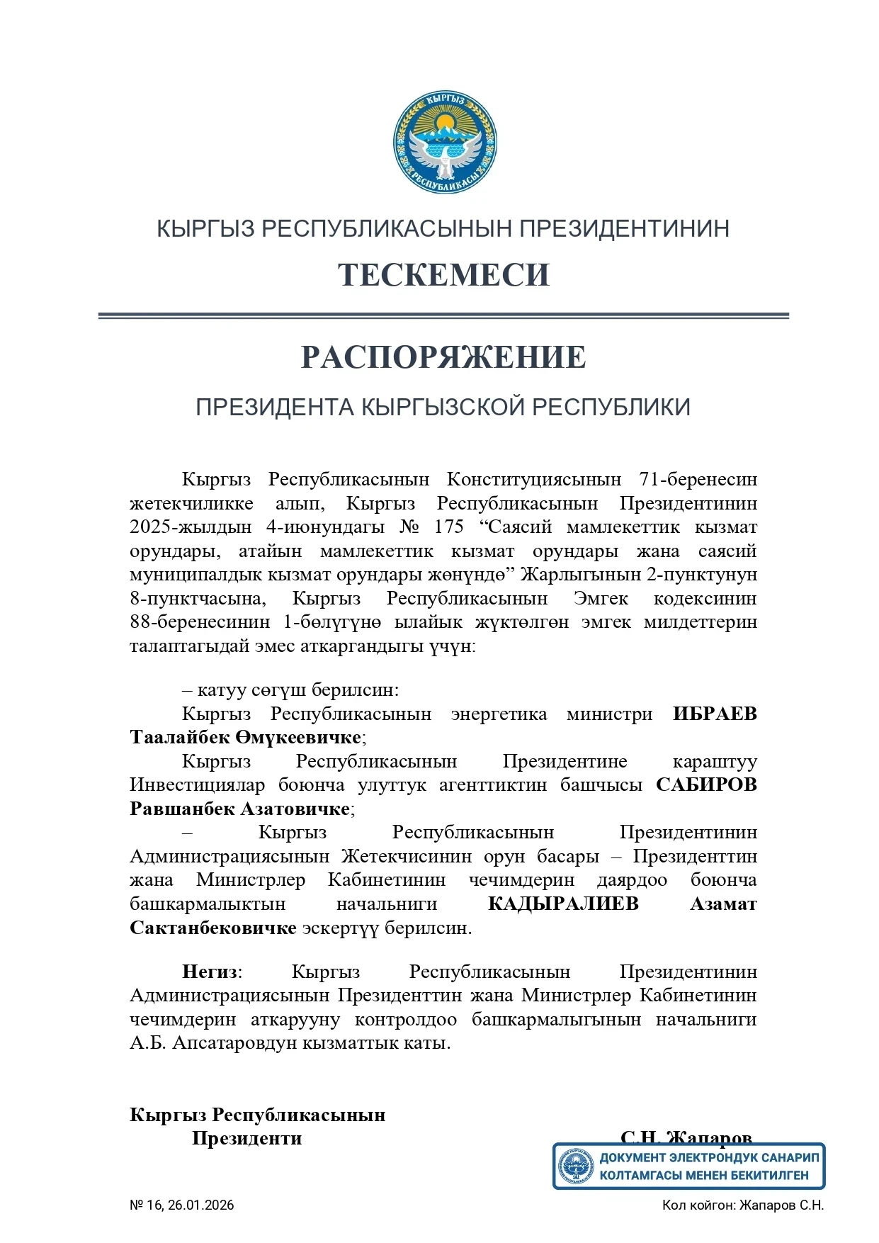 Президент КР объявил строгий выговор министру энергетики Таалайбеку Ибраеву