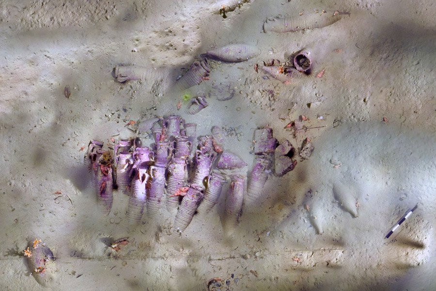 Команда обнаружила около 40 амфор, видимых на морском дне на глубине 230 футов. Некоторые из них все еще были сгруппированы в своем первоначальном положении, поскольку они хранились в трюме корабля. Никаких останков самого корабля не видно, так что если они пережили тысячелетия, они погребены под песком вместе с остальным грузом.