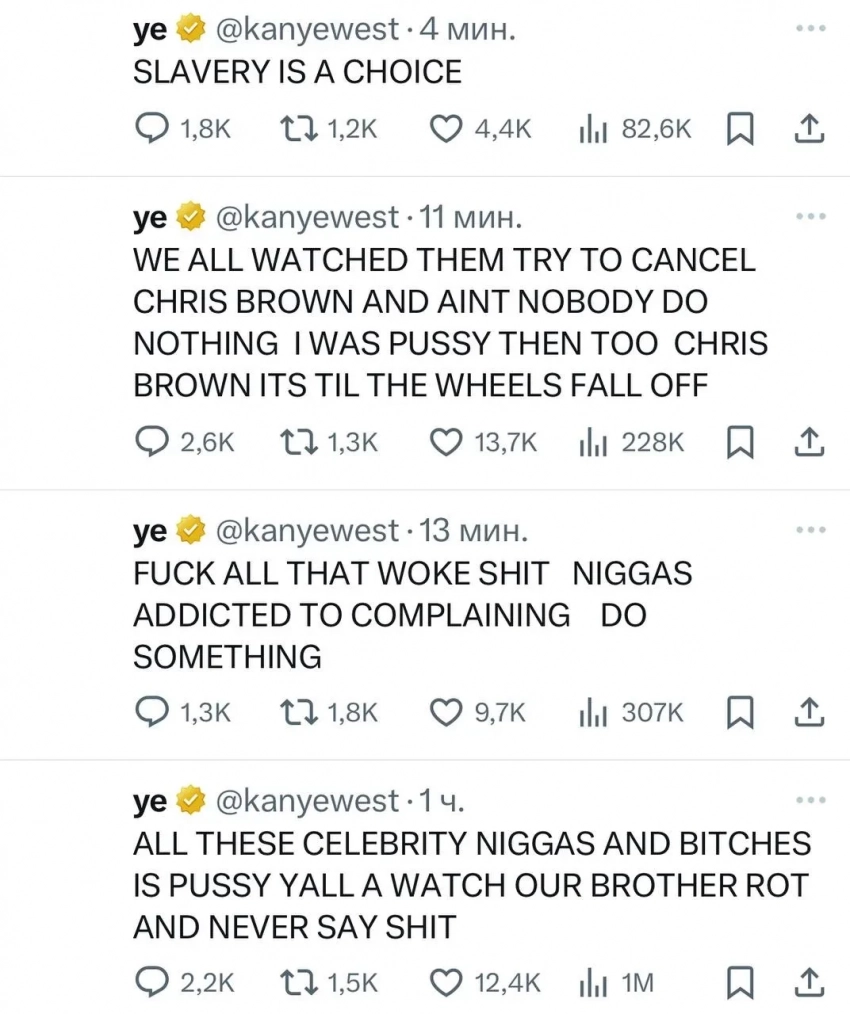 Пост из инстаграма* Канье УэстаПост из инстаграма* Канье УэстаПо словам Канье, Пи Дидди намеренно пытаются "отменить", как ранее — Криса Брауна (его также обвиняли в изнасилованиях и физическом насилии). "Мы все смотрели, как забирают Криса Брауна, и никто ничего не делал". Он также отметил, что "рабство — это выбор", и представил футболки с настоящим именем Пи Дидди — Шон Комбс. По словам Канье, коллаборация якобы планировалась ещё до того, как Пи Дидди посадили.