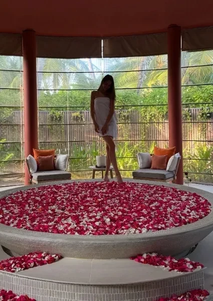 На одном из снимков Юлия стоит в красном платье в ресторане, а на столе рядом с ней — большой букет роз. Также Полячихина добавила несколько кадров, где она позирует в одном полотенце перед бассейном с лепестками роз.