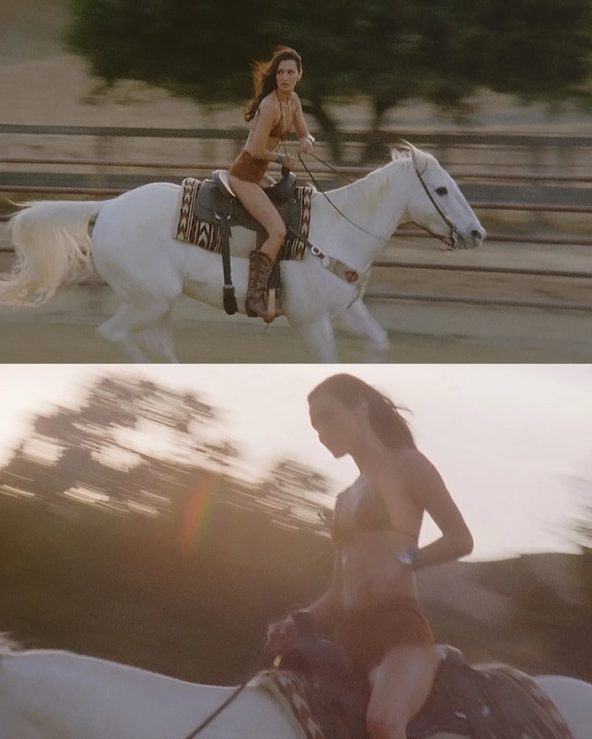 Белла уже более 15 лет сотрудничает с брендом Frankies Bikinis, а теперь создала с ним совместную коллекцию купальников в ковбойском стиле. На новых снимках Хадид демонстрирует некоторые модели купальников, а также позирует в них во время купания и езды на лошади.