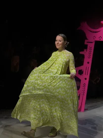 Собчак продефилировала на показе бренда Vereja в платье с растительным орнаментом и с пышной юбкой с кринолином. Однако подол наряда оказался слишком длинным, так что ведущей пришлось придерживать юбку за каркас.
