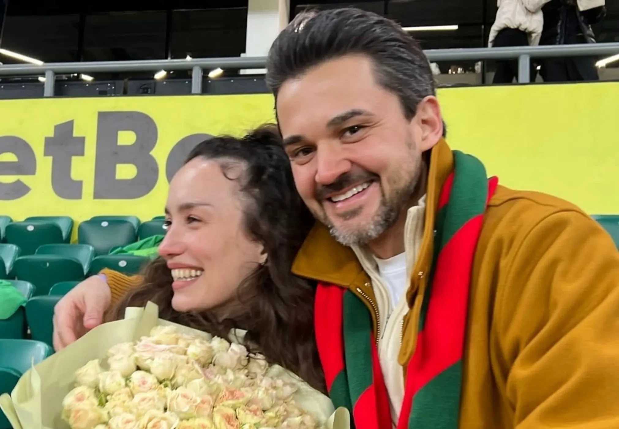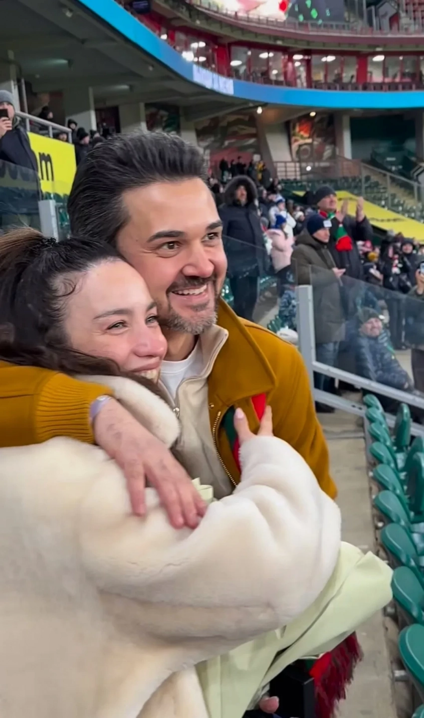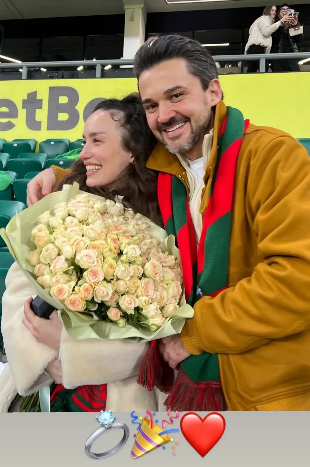 Артистка опубликовала фото и видео радостного события в своих соцсетях. На кадрах можно увидеть, что она не может сдержать слез: ее будущий супруг преподнес ей большой букет цветов и кольцо под ее песню “Стоп, куда же я иду”, в то время как на экране стадиона появилось изображение пары с надписью “Выходи за меня”.