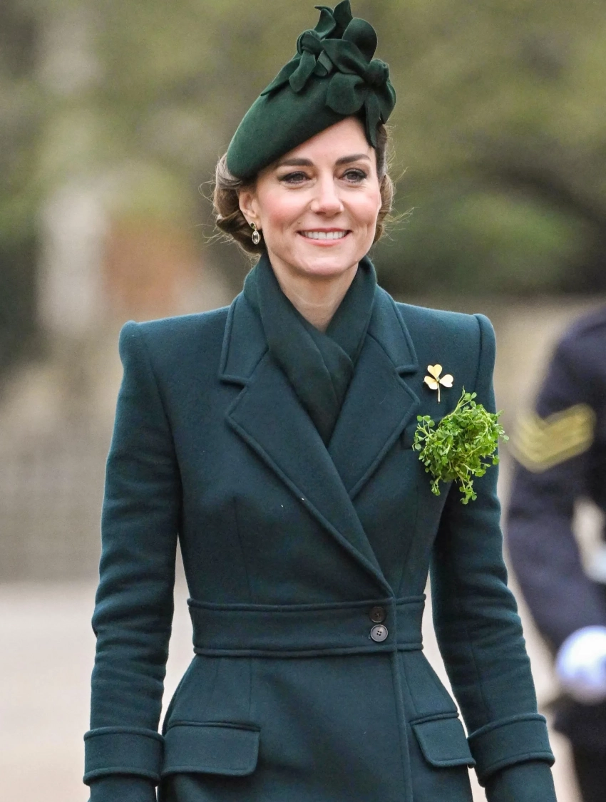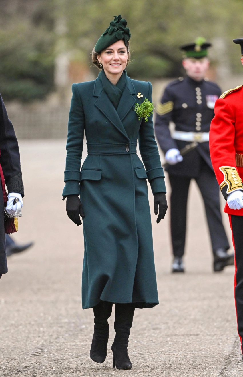Перед военнослужащими Ирландской гвардии в графстве Гемпшир на юге Англии 43-летняя Кейт появилась в зелёном пальто Alexander McQueen, дополнив образ чёрными сапогами на каблуке и шляпкой с цветком. Пальто герцогини украшала золотая брошь в виде трилистника. Супруг Кейт Миддлтон, 42-летний принц Уильям, не сопровождал жену во время этого визита.