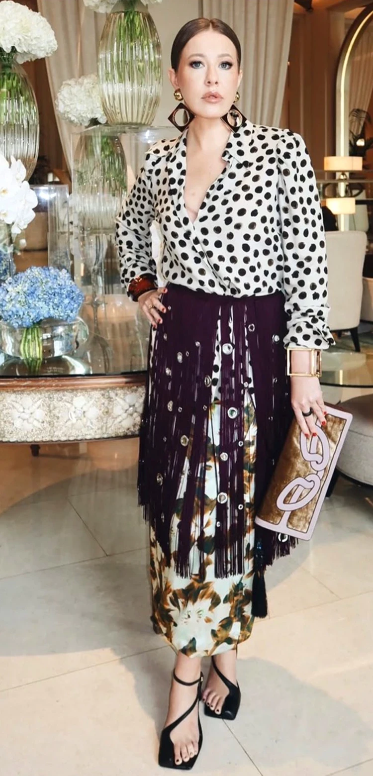Ксения иронично охарактеризовала свой стиль, как «с легкой *******». Что ж, с ней трудно не согласиться. Особенно глядя на эти босоножки, которые я бы назвала «пальцы наружу». Оригинальный дизайн поймут единицы. Да и пальчики во время ходьбы, скорее всего, расползаются. Эксцентричные босоножки Собчак сочетала с пестрой юбкой, блузой в горох от Dries Van Noten и дополнила поясом Prada. Жаль, что бренд незабываемой обуви журналистка не указала.