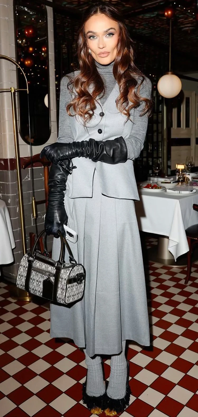 У Алены целая коллекция удивительной обуви! Есть среди них и туфли из блестящей мишуры, которые блогер сочетала с толстыми серыми носками. Что же, какая обувь, такая и стилизация. Все это великолепие журналистка скомбинировала со строгим офисным костюмом и серой водолазкой. Плюс длинные черные перчатки. В таком образе Водонаева отправилась на день рождения к подруге. А вот в офис так лучше не ходить.