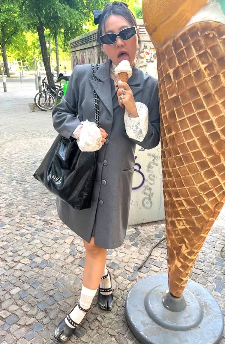 Как и Татьяна Брухунова, Ян Гэ тоже является поклонницей «таби». На ногах актрисы и певицы можно наблюдать модель с шипами и потертыми носами. Поношенные балетки в стиле Мэри Джейн Ян Гэ сочетала с объемным жакетом, костюмным платьем и кружевной блузой. Плюс сумка-мешок Chanel и бантик… на голове.