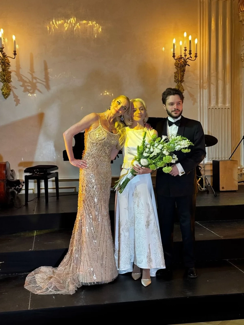 На снимках Анастасия позирует на украшенной лестнице в золотом платье со шлейфом, Ариадна же появилась в белом платье без рукавов. Позже Анастасия опубликовала ещё несколько снимков с дочерью и зятем. "Свадьба Ариадны Волочковой состоялась <...> Вопреки всем, кто пытался внести распрю и провокации в нашу семью", — подписала 49-летняя Волочкова фотографии.