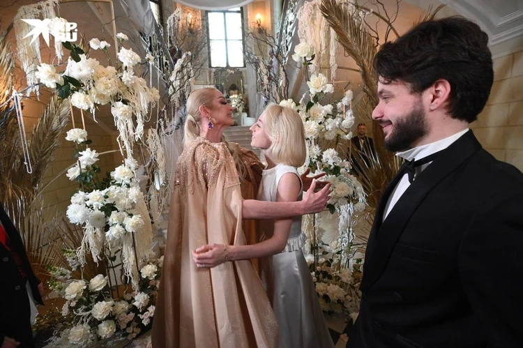 Ариадна и Никита все еще задерживались. Гости уже выстроились на лестнице, в ожидании жениха и невесты. Внизу у лестницы дежурили Волочкова и ее мать. Наконец, у особняка остановился простенький черный «Мерседес», из которого вышли виновники торжества. Молодоженов встретили с криками, обкидав их лепестками роз. Балерина и бабушка Ариадны не сдержали слез во время объятий.