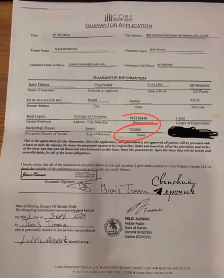 А именно, Райтис Тимма обнародовал договор аренды апартаментов в США для старшей дочери Анны, Алины Белькевич, в котором поручителем и гарантом значится “отчим Янис Тимма”. “Поручителем и финансовым гарантом по нему, как вы думаете, кто выступал? Седокова? Да что вы. Янис Тимма. Да-да, тот самый безработный бездельник, который жил за ее счет. Каким-то чудесным образом у безработного не баскетболиста имелась финансово-кредитная история, подтверждающая получение ежемесячного дохода от спортивного баскетбольного клуба”, — рассказал Райтис.