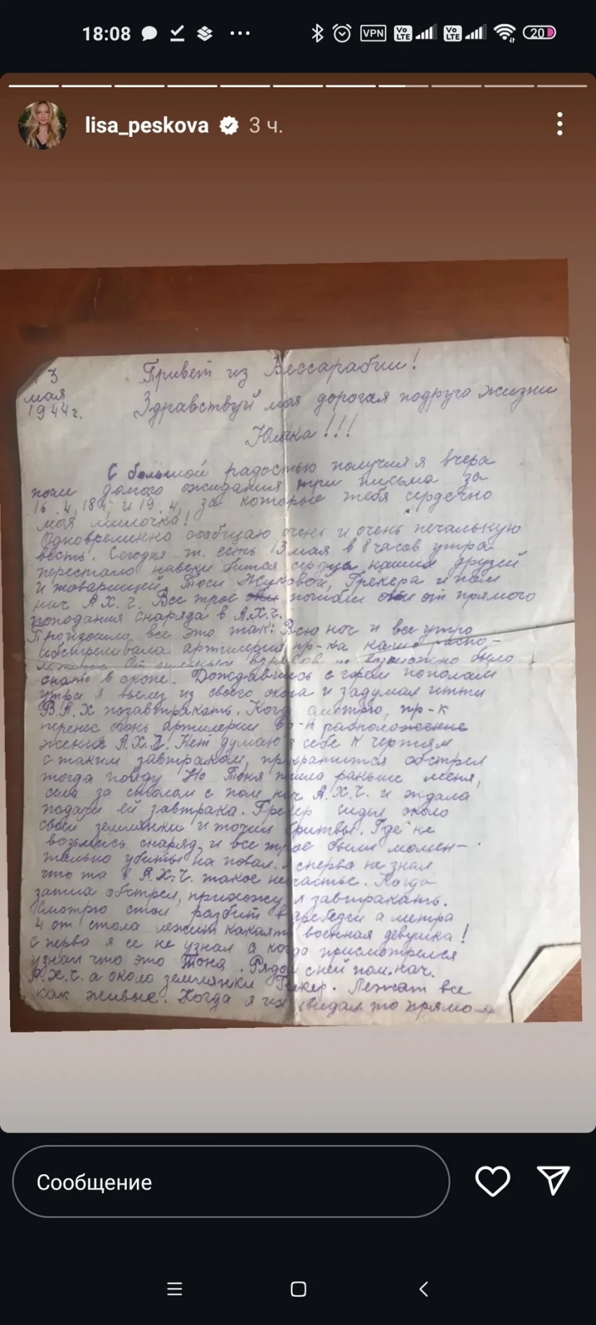 Друзья, поздравляю вас с великим праздником с Днём Победы! От всей души желаю беречь наших дорогих ветеранов Их истории, воспоминания родных и близких помогают сохранить память о Великой Отечественной Войне. Моя бабушка пережила оккупацию, пряталась от врага в землянке с моей мамой, которая была ещё ребёнком. Дедушка прошёл войну, получил тяжёлое ранение под Ростовом-на-Дону и потом работал в тылу. Они оба преодолели столько трудностей, но сохранили доброе сердце, чувство юмора и умение сочувствовать другим людям. Они навсегда останутся в моём сердце, их героизм и стойкость вдохновляют меня каждый день. Гордость, благодарность и любовь к ним непоколебимы. Пусть наша общая память о тех, кто боролся и пожертвовал собой ради мира, живёт вечно. С праздником, дорогие друзья!Ирина БезруковаФото Лизы ПесковойЛиза Пескова