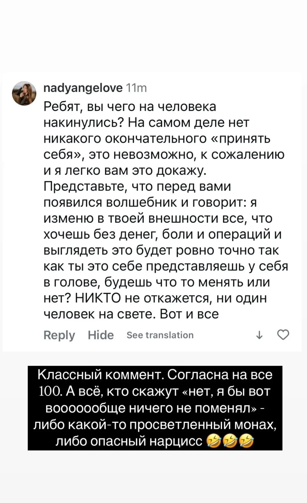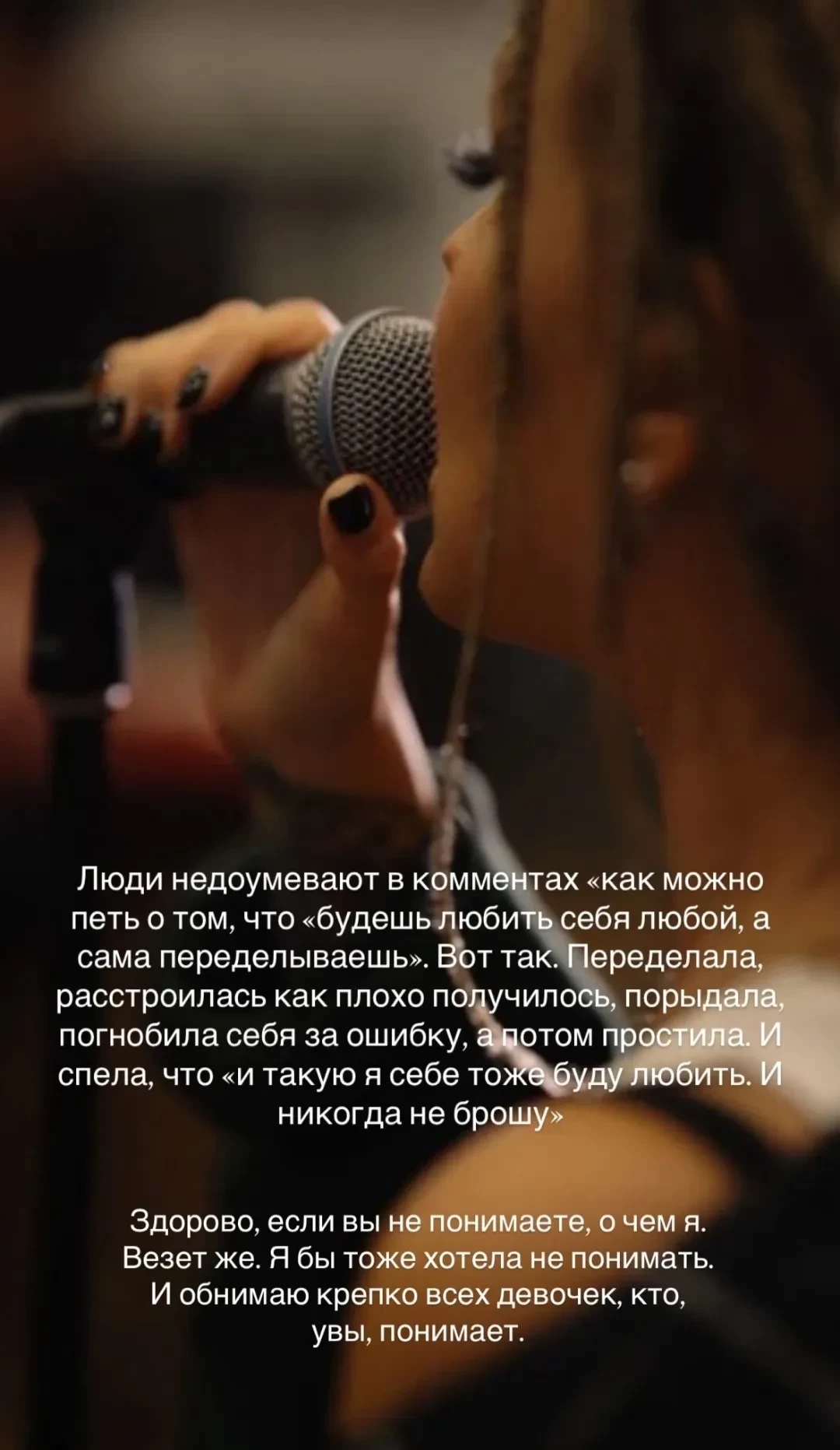 Скриншот из инстаграма* Риты ДакотыСкриншот из инстаграма* Риты ДакотыСкриншот из инстаграма* Риты ДакотыПри этом она заявила, что не собирается из-за новой внешности уходить в тень: "Что же мне делать теперь? Уйти навсегда из соцсетей и со сцены? Закрыться от мира? Не выкладывать больше сниппетов? Или слушать от жестоких баб кучу оскорблений в комментах теперь всю жизнь?". Рита не стала скрывать, что плакала из-за "чужого" лица в отражении, но в итоге решила, что будет любить себя любой, даже "такой вот стрёмной, отёкшей и некрасивой, с уродскими глазами и даже без глаз".