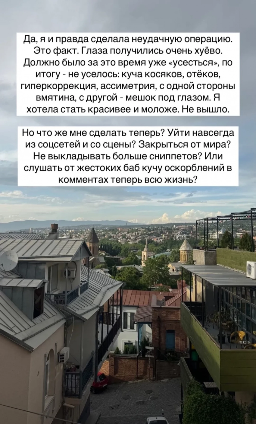 Рита ДакотаРита Дакота"Да, я и правда сделала неудачную операцию. Это факт. Глаза получились очень ***** (плохо. — Прим. ред.). Должно было за это время уже "усестья", но по итогу не уселось: куча косяков, отеков, гиперкоррекция, асимметрия, с одной стороны вмятина, с другой — мешок под глазом. Я хотела стать красивее и моложе. Не вышло", — написала Рита.
