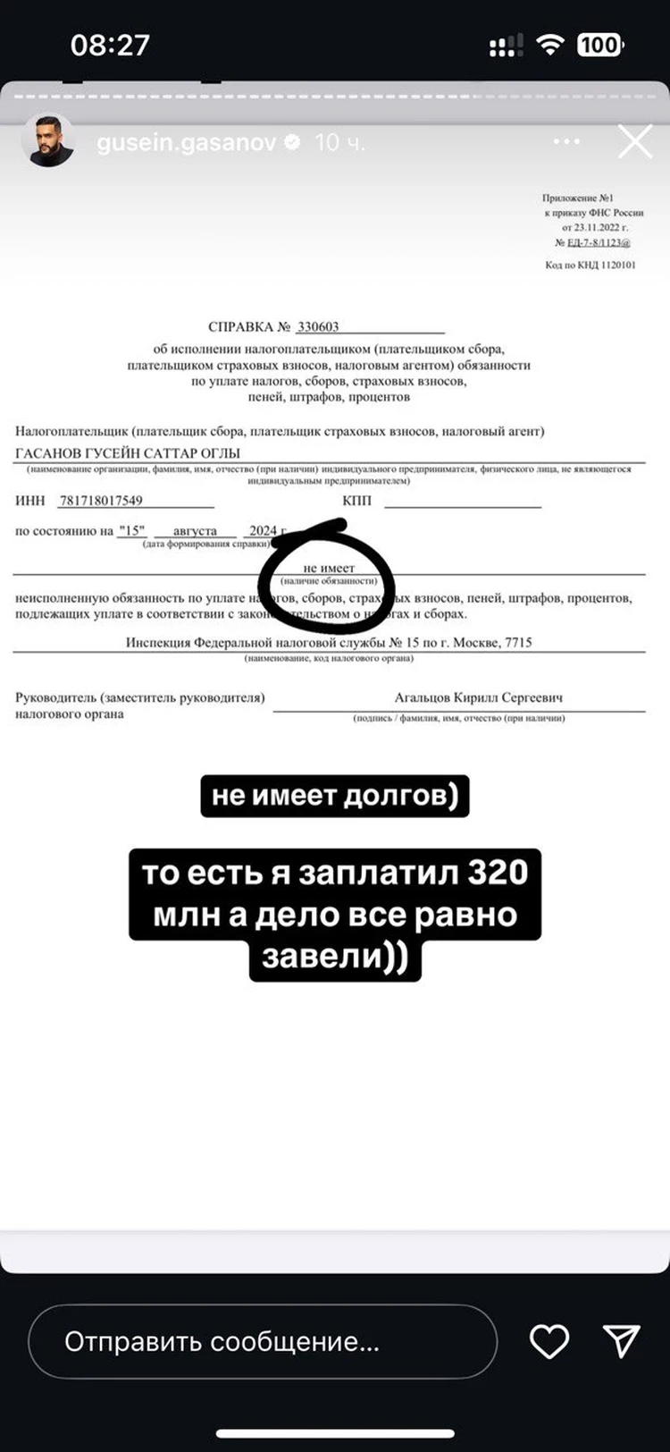 Блогер опубликовал документ, что долгов по налогам не имеет. По его словам, он выплатил государсту 320 миллионов рублей, но дело на него все равно завели. Гасанов считает, что к этому приложила руку Екатерина Мизулина.