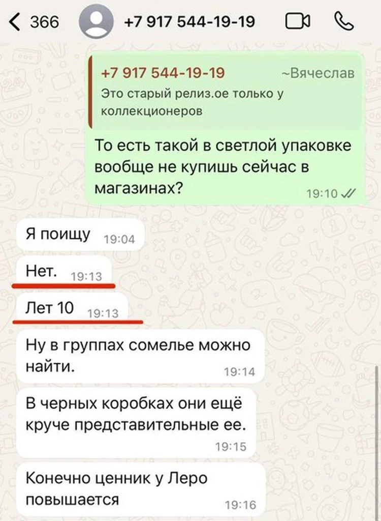 В подарок была предоставлена гораздо более редкая бутылка, а следовательно, и более дорогая, того же напитка, который нашёл Толмацкий у этого продавца. Реально же продавец предлагает её за 159 490 руб. Вы видите это в переписке. И, конечно, цены, указанные в интернете, могут отличаться от реальных. Кроме того, этих товаров может не быть в наличии. Надо проверять, а не сразу бросаться обвинениями! Обратите внимание, что этот винтажный напиток уже как 10 лет не продается в магазинах. Именно это объясняет отсутствие чека и оплату физическому лицу. Также обратите внимание, что номер телефона магазина в переписке совпадает с номером, который указан на скриншоте Толмацкого. И вот с этой фейковой информации, преподнесенной Толмацким, начался скандал», — пояснил KP.RU Никита Турчин.