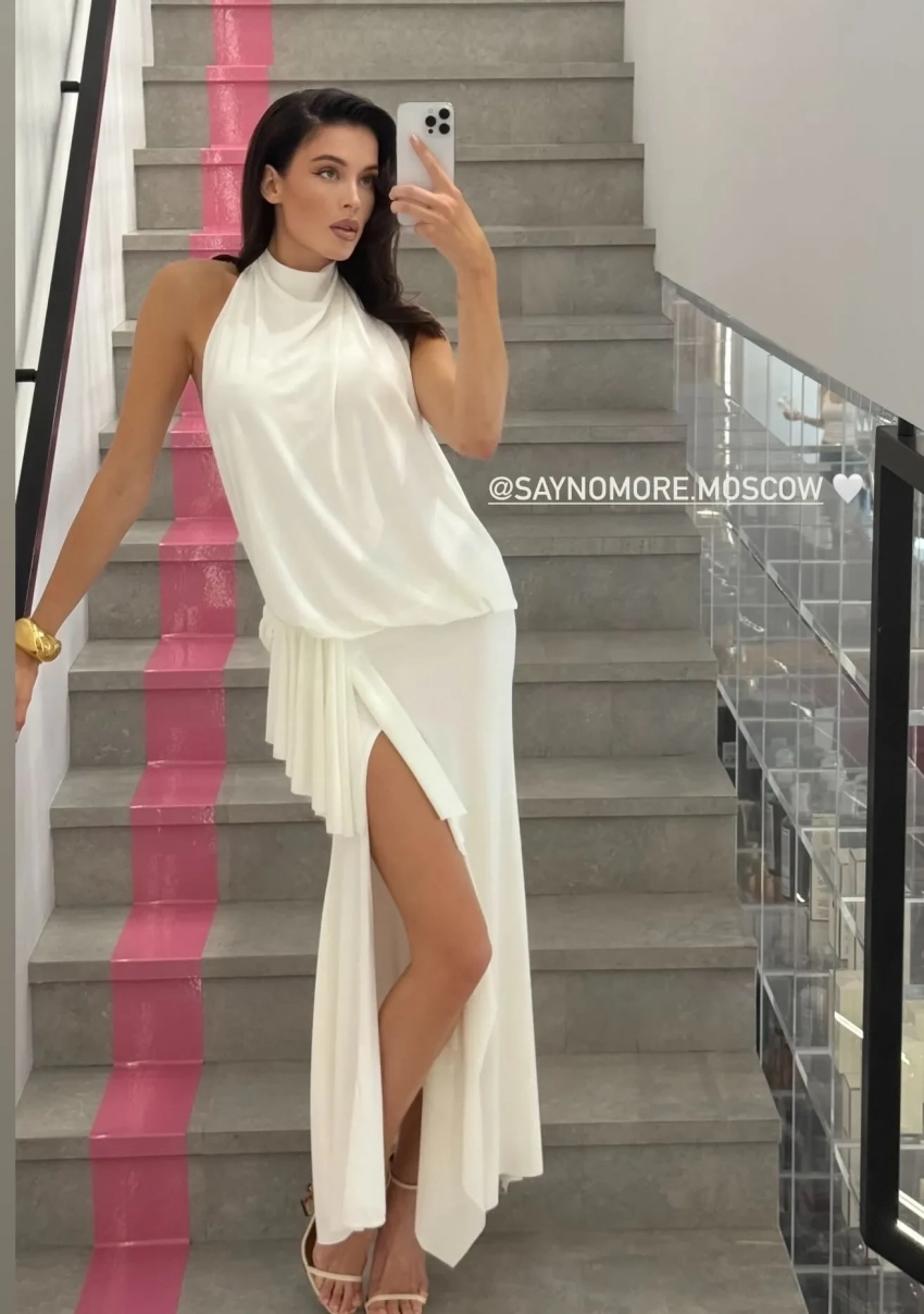31-летняя экс-возлюбленная сына миллиардера Бориса Зингаревича встречала гостей в белом платье Say No More с открытой спиной и босоножках Saint Laurent. После инцидента на таможне, который перерос в уголовное дело, модель стала носить меньше дорогих украшений и дополнила свой образ не многомиллионными изделиями от Cartier, а одним золотым браслетом. (Хотя для фото она примерила и другие украшения).