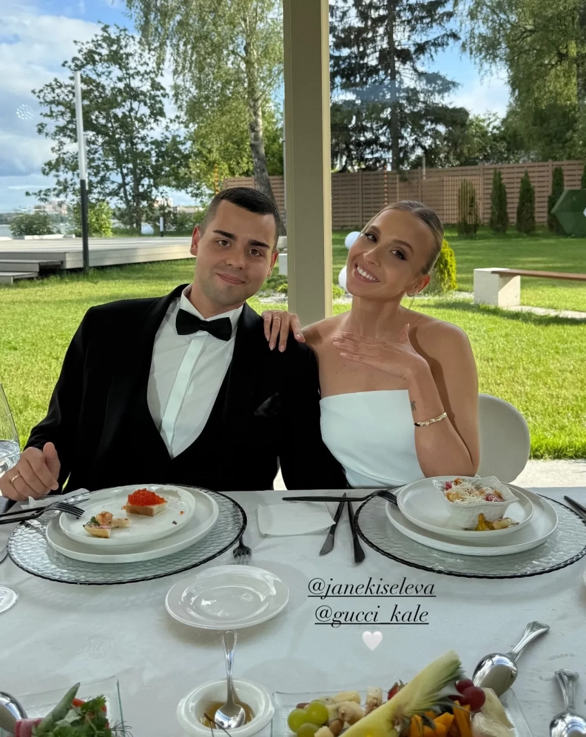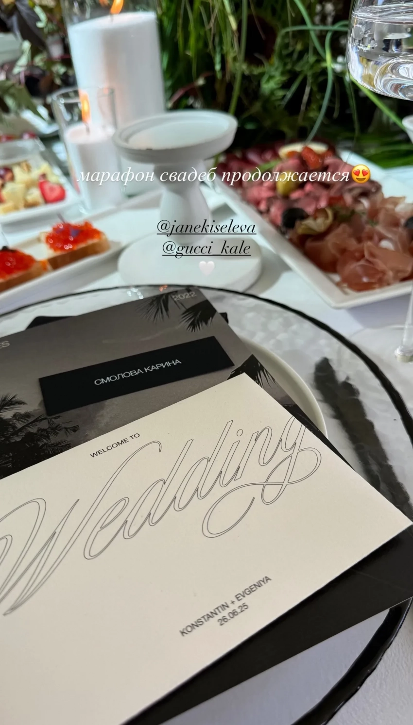 "Сезон свадеб продолжается! Вчера и сегодня ходили на свадьбы наших друзей. Вчера к Фединым, сегодня к моим", — написала Карина. Супруги пришли на праздник в чёрном — Истомина надела платье бренда Say No More, туфли Jimmy Choo и чокер Сhrome Hearts, дополнив образ сумкой Hermes и ювелирными украшениями, а Фёдор выбрал классический костюм с белой рубашкой.
