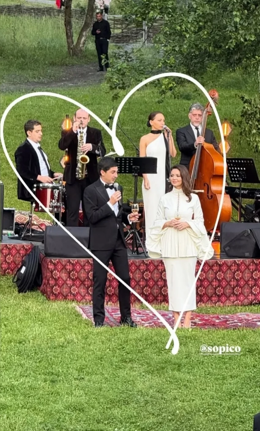 Торжество устроили в национальном стиле. Для гостей организовали фуршет на природе, расстелив ковры прямо на траве. Гиоргий исполнил для возлюбленной несколько песен, также молодожёны танцевали под живой мини-оркестр. Ближе к вечеру приглашённые переместились в помещение, где их развлекали профессиональные артисты. На свадьбе, разумеется, присутствовали родители невесты.