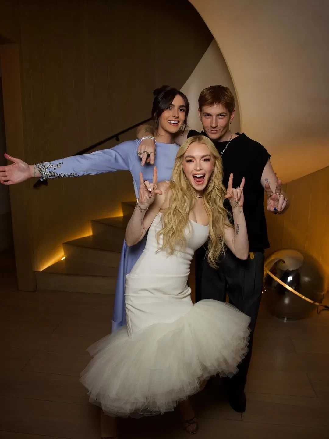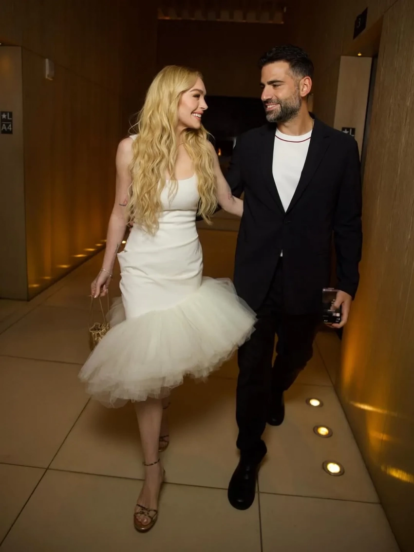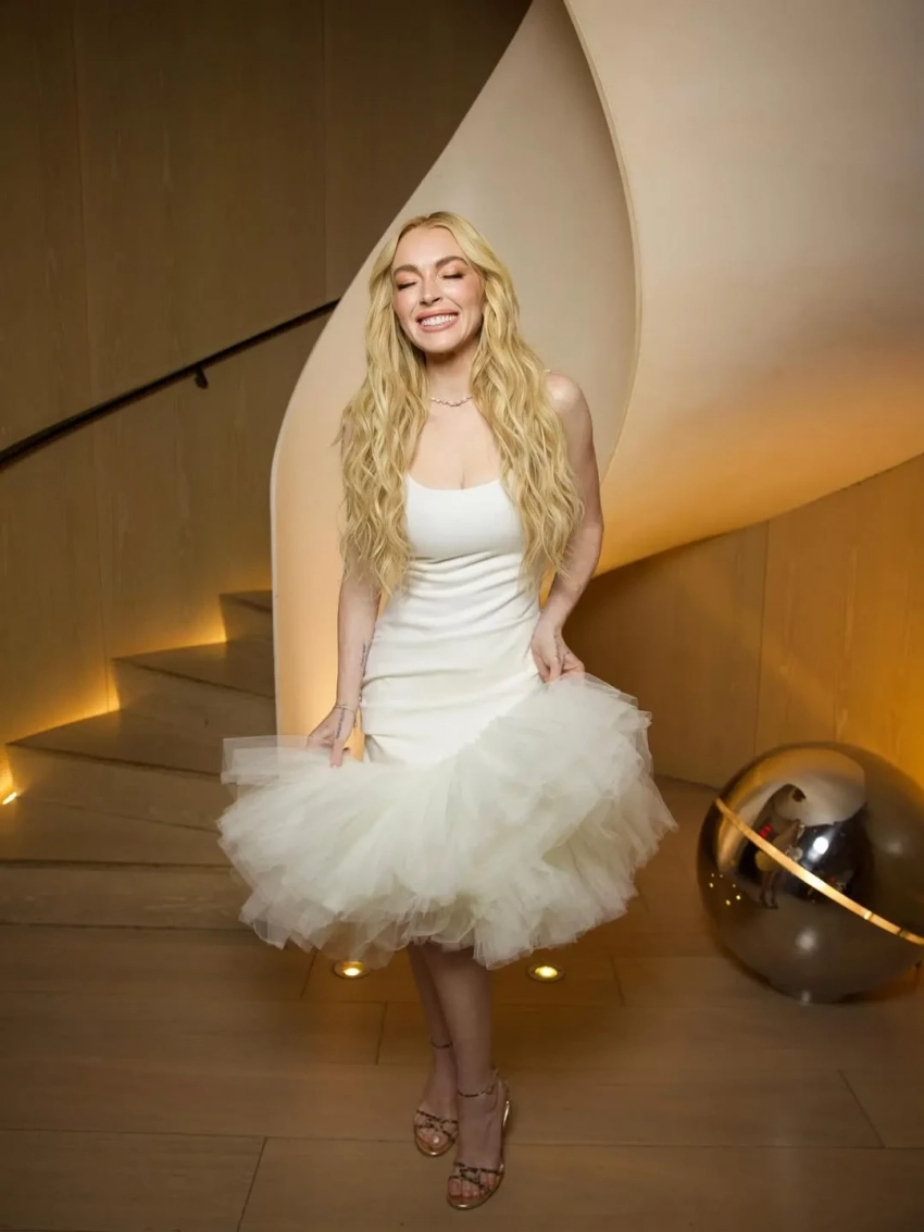 Звезда надела на премьеру белое платье Jacquemus с асимметричной юбкой и золотые босоножки на каблуках. На дорожку также вышли коллеги Линдси по фильму — Джейми Ли Кёртис и Чад Майкл Мюррей.