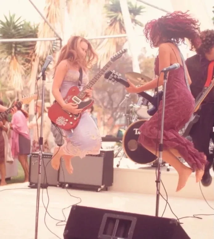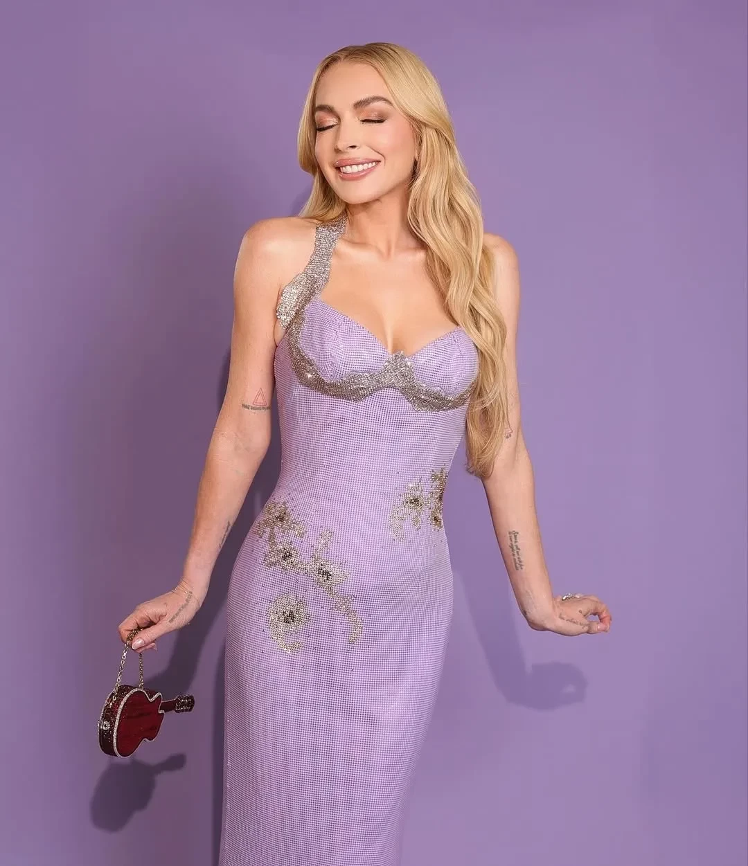Звезда, преображение которой последний год все обсуждают, позировала на дорожке в лиловом платье Ludovic de Saint Sernin. Дизайнер специально воссоздал платье героини Линдси, а образ дополнила сумочка в виде красной гитары — тоже отсылка к сцене из фильма.