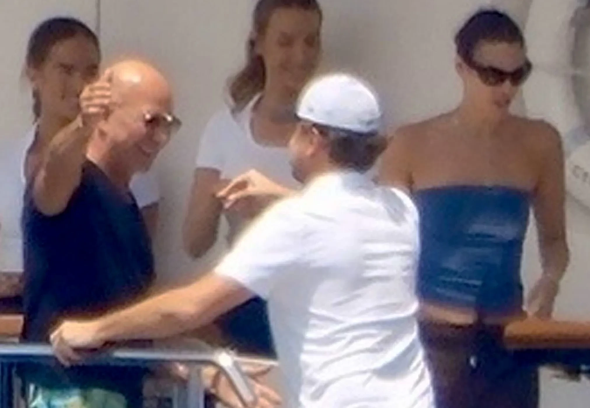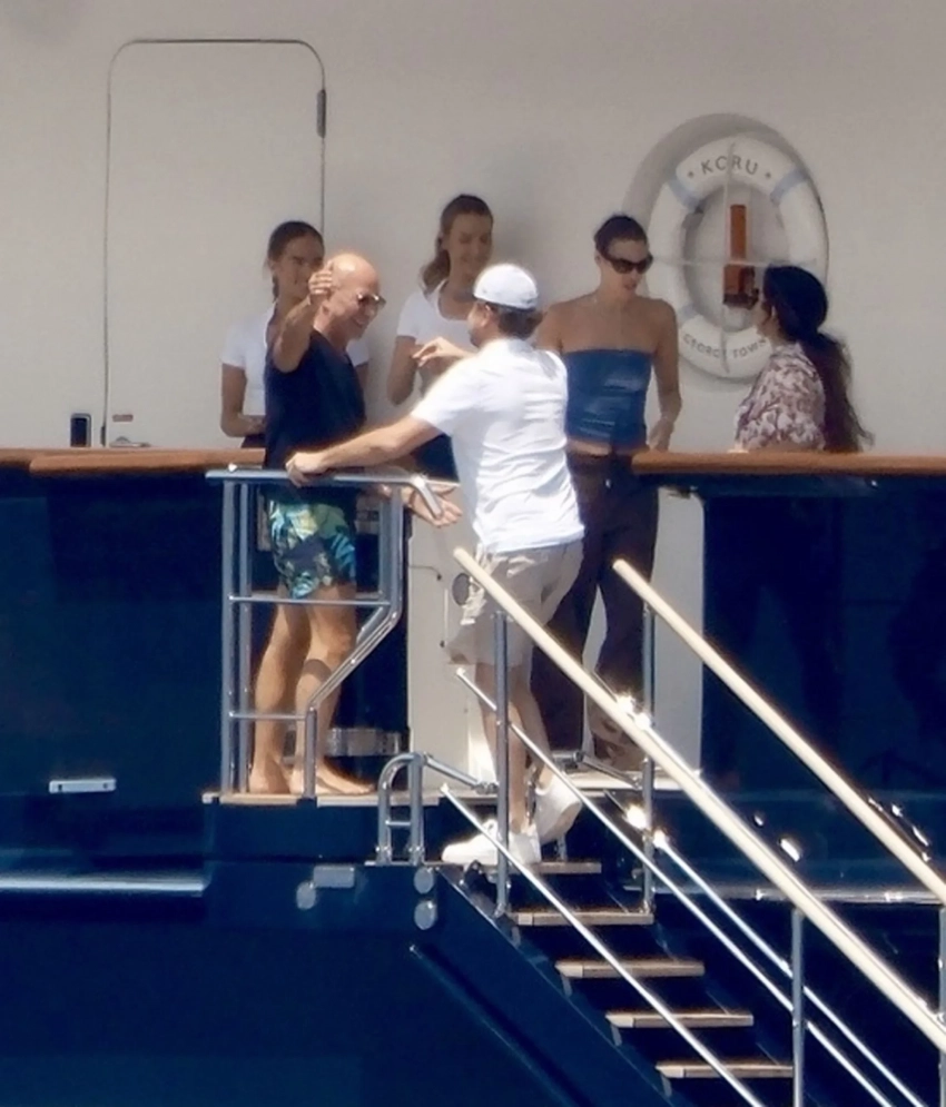 Джефф Безос, Леонардо ДиКаприо, Виттория Черетти и Лорен Санчес (справа)50-летний голливудский актёр и 27-летняя супермодель попали в объективы папарацци, когда прибыли к яхте на катере и поднялись на палубу, где их уже ждали 61-летний Безос вместе со своей 55-летней супругой и двумя работницами персонала. Джефф и Лорен с улыбкой встретили и обняли друзей.
