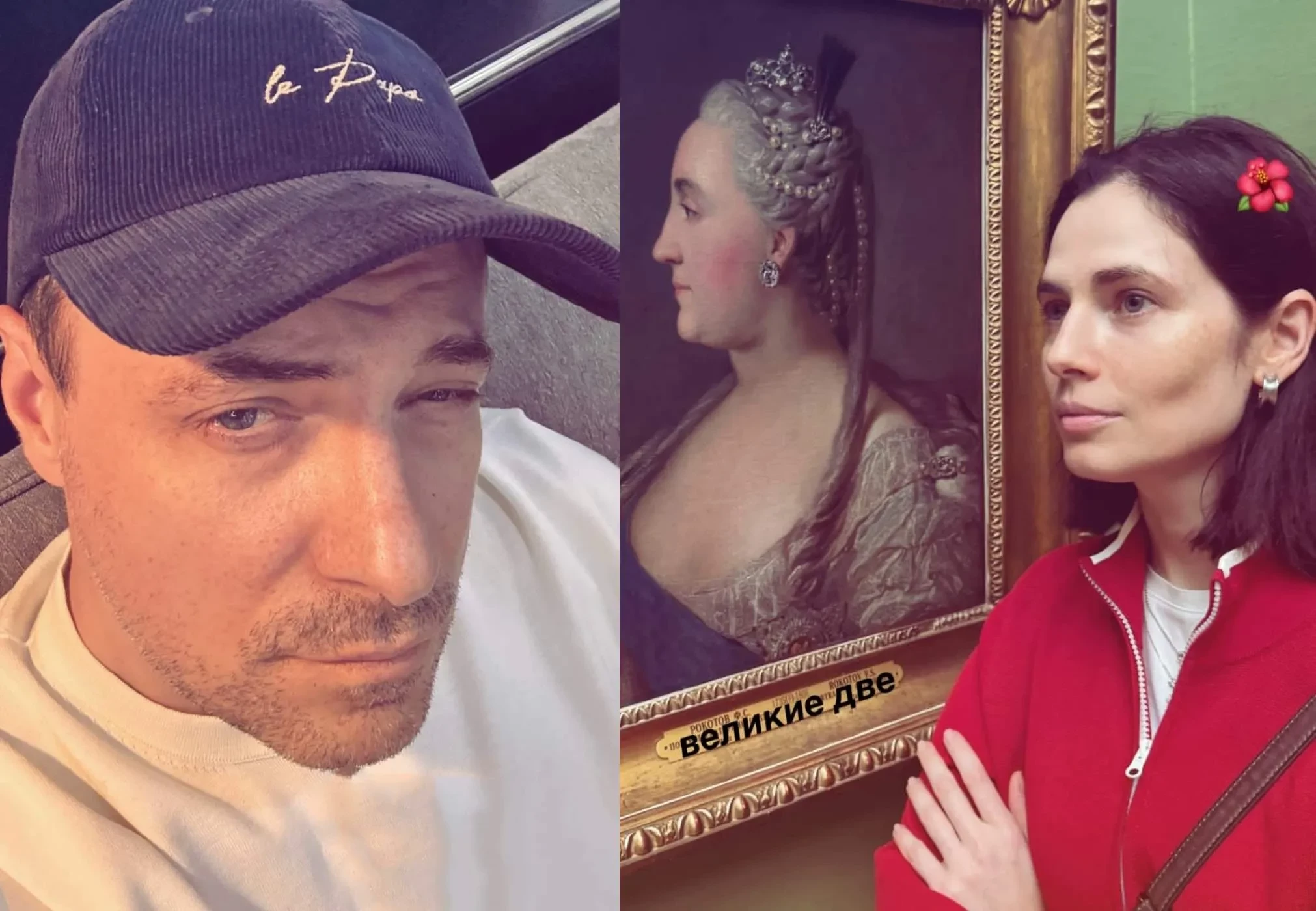 Актёр опубликовал серию фотографий, на которых он и Юлия позируют на фоне картин. Так, на одном из снимков Снигирь стоит у портрета российской императрицы Екатерины II. “Великие две”, — подписал Евгений этот кадр.