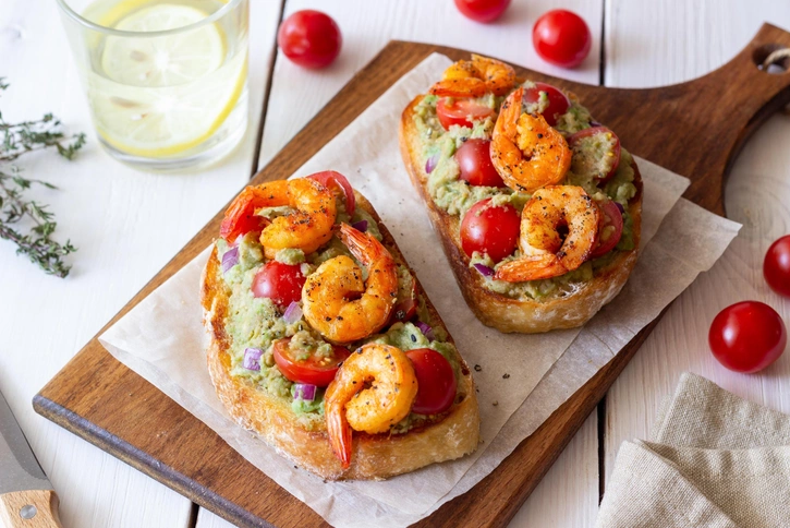 Сверху выложите креветки и томатную смесь. Украсьте ростками и подавайте сразу.