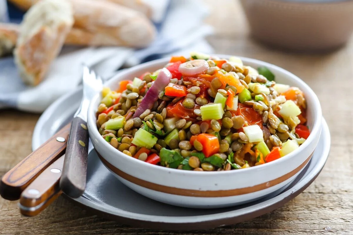 Этот салат сочетает в себе питательные свойства чечевицы и свежесть овощей.