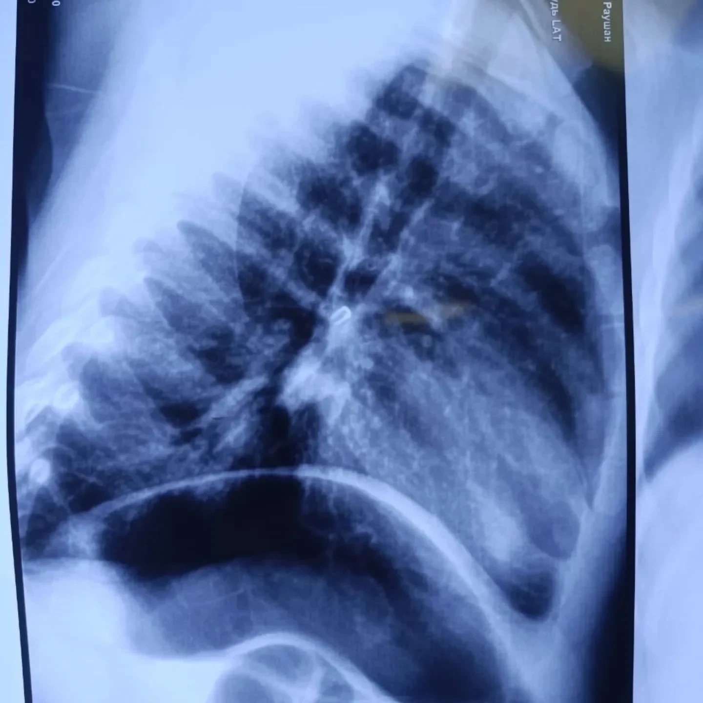 При поступлении в больницу состояние малыша оценивали как тяжелое, так как у него наблюдалась дыхательная недостаточность. Рентгеновское исследование выявило инородное тело в области правого главного бронха.