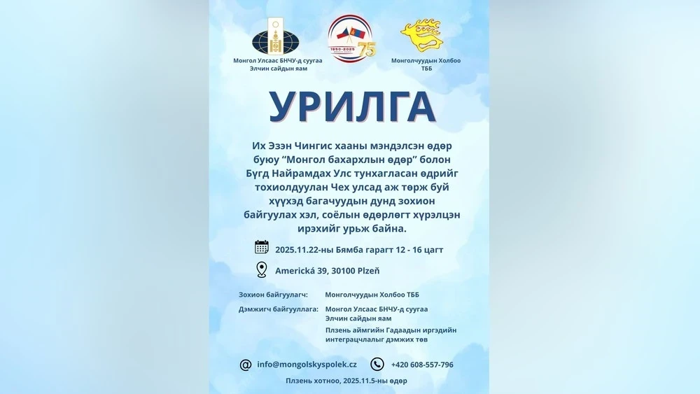 Важное событие пройдет 22 ноября 2025 года, в день рождения Чингисхана, когда отмечается День национальной гордости Монголии. Оно организовано совместно с посольством Монголии в Чешской Республике, «Школой понедельника» в Пардубице, Ассоциацией монголов в Пльзене и местными Центрами поддержки интеграции.