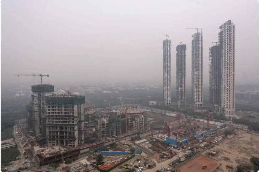Строящиеся здания в Нойде, пригороде Нью-Дели, окутаны густым смогом 29 октября 2025 года