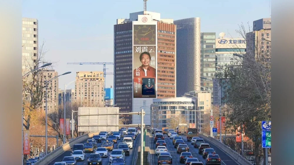 Реклама романа Лю Чжэньюня《咸的玩笑》(Salty Jokes), который был опубликован всего несколько дней назад, размещена на центральной улице Пекина.