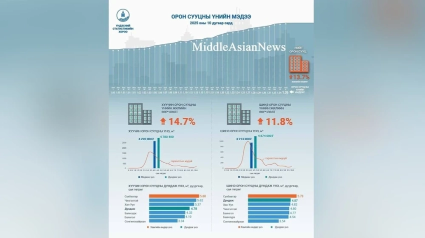 Сравнение с 2024 годом показывает, что в районе Сонгинохайрхан средняя цена на новые квартиры увеличилась на 6.9%, в то время как самый низкий рост наблюдается в Чингэлтэй — всего 0.2%.