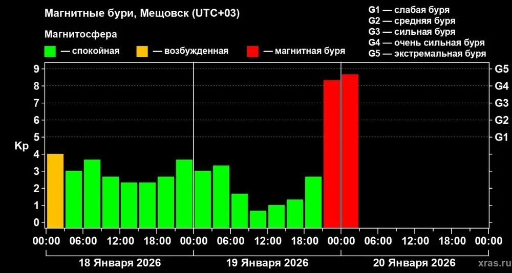 18 января на Солнце произошла мощная вспышка класса X19.5, после которой облако плазмы должно было достичь Земли в ночь на вторник, что приведет к магнитным бурям и полярным сияниям. Специалисты ИКИ РАН отметили, что «такие события крайне трудно прогнозировать», и ожидали, что наиболее сильные магнитные возмущения уровня G4 произойдут во вторник с 9:00 до 12:00 по московскому времени, при этом вероятность возникновения магнитных бурь уровня G5 оценена всего в 10%.