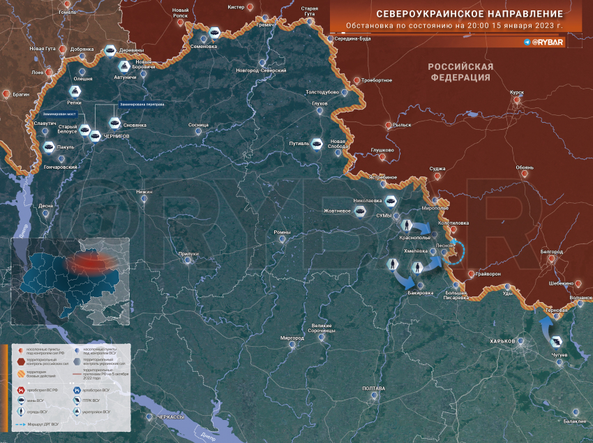 Североукраинское направление обстановка по состоянию на 20.00 15 января 2023 года от Телеграм-канала «Рыбарь»