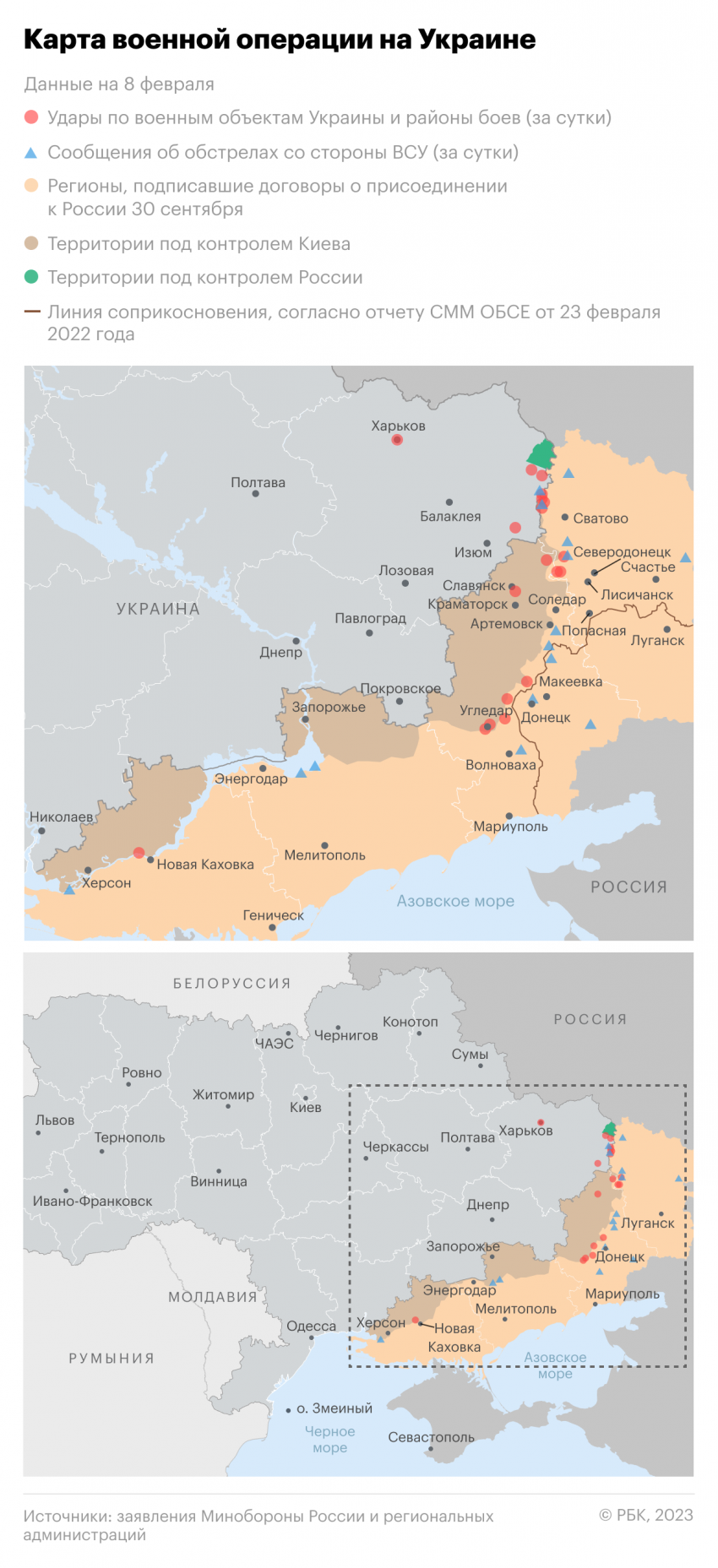 Обновленная карта военной операции на Украине на 9 февраля 2023 года: ООН готово рассмотреть доказательства применения Украиной химического оружия