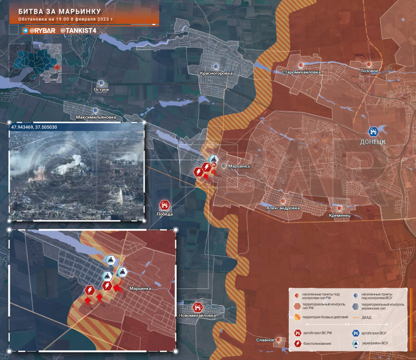 Битва за Марьинку обстановка по состоянию на 19.00 8 февраля 2023 года от Телеграм-канала «Рыбарь»