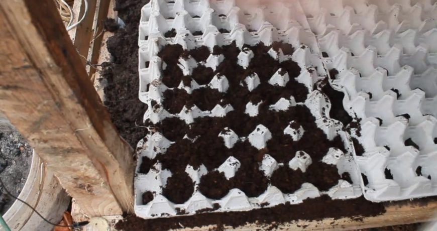 Обычно используются картонные лотки с 30 ячейками. Желательно прогреть их в духовке, чтобы предотвратить сальмонеллёз. При помощи канцелярского ножа нужно срезать донышки конусообразных ячеек, сделав таким образом 30 посадочных мест.